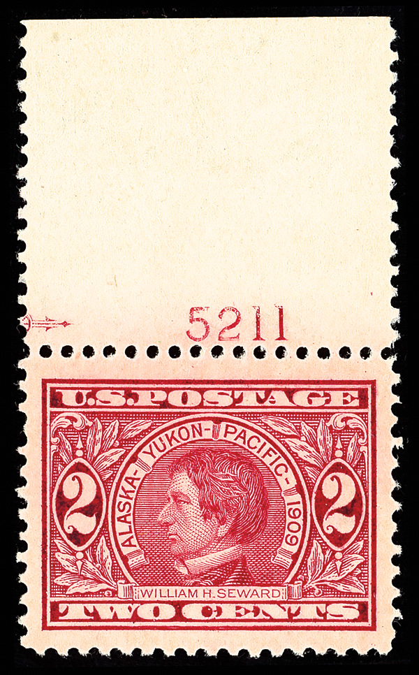 5082 nh 370 image1909, 2¢ Alaska-Yukon (Scott 370), single with plate number, extra-wide margins add striking appeal, o.g., never hinged, Extremely Fine to Superb, with 2008 P.S.E. certificate graded XF-SUP 95.