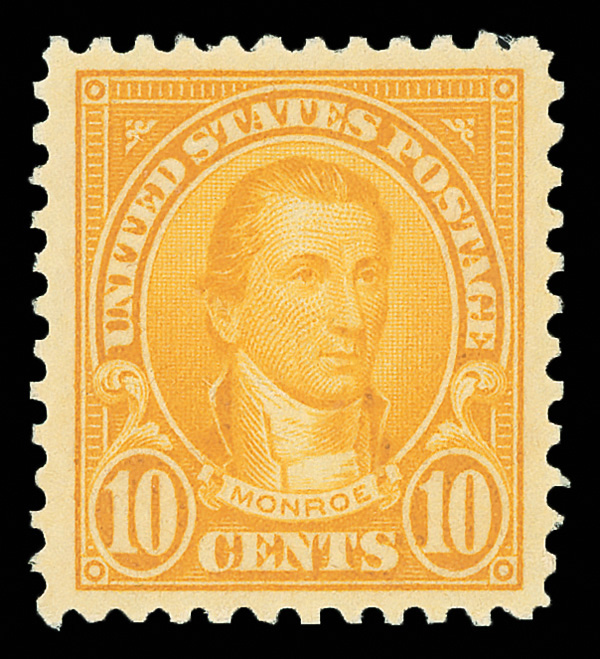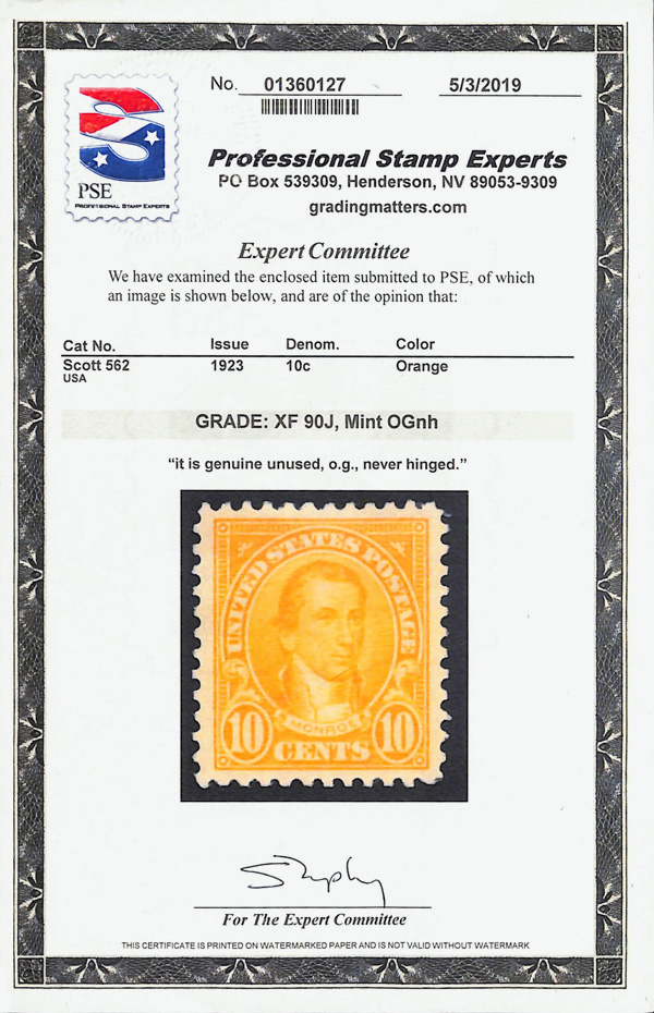 5118 nh 562 image1923, 10¢ Monroe (Scott 562), bold saturated color, massive framed margins, o.g., never hinged, Extremely Fine, with 2019 P.S.E. certificate graded XF 90J.