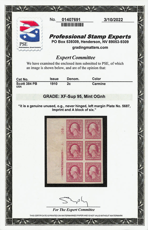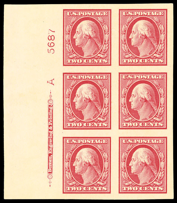 5087 nhbl 384 image1911, 2¢ carmine, S.L. watermark, imperf. (Scott 384), left margin plate block of 6 with A, large margins elevate visual impact, o.g., never hinged, Extremely Fine to Superb, with 2022 P.S.E. certificate graded XF-SUP 95.