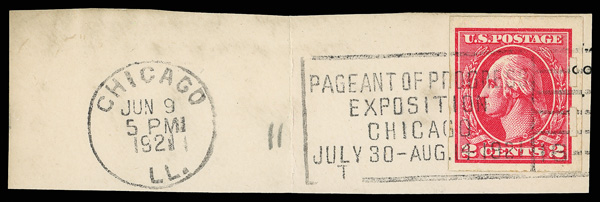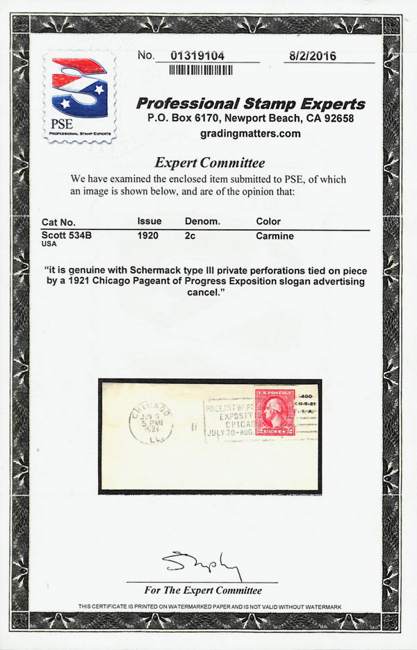 5111 Z 534B var. image1918, 2¢ carmine, type VII, offset printing, imperforate, with Schermack Type III private vending perforations (Scott 534B var.), pretty example with bold color, tied on piece by June 9, 1921 Chicago "Pageant of Progress Exposition" slogan advertising cancel; piece vertically folded to left of slogan, Fine to Very Fine, with 2016 P.S.E. certificate.