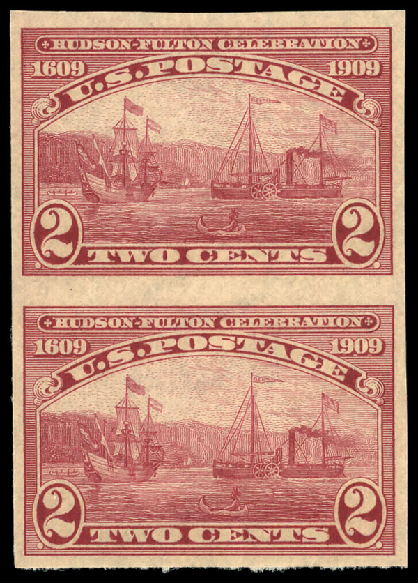 5086 nh 373 image1909, 2¢ Hudson-Fulton, imperf. (Scott 373), vertical pair, o.g., never hinged, Very Fine.