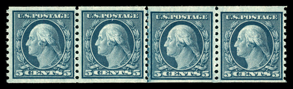 5100 nh 496 image1919, 5¢ blue, unwatermarked, rotary press coil, perf. 10 vertically (Scott 496), joint line strip of 4, o.g., never hinged, Very Fine.
