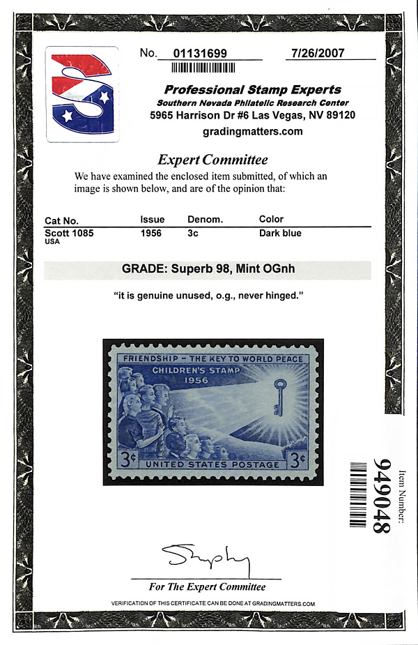5203 nh 1085 image1956, 3¢ Children (Scott 1085), o.g., never hinged, Superb, with 2007 P.S.E. certificate graded SUP 98.