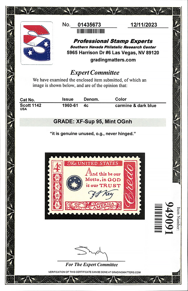 5205 nh 1142 image1960, 4¢ American Credo: Francis Scott Key (Scott 1142), o.g., never hinged, Extremely Fine to Superb, with 2023 P.S.E. certificate graded XF-SUP 95.