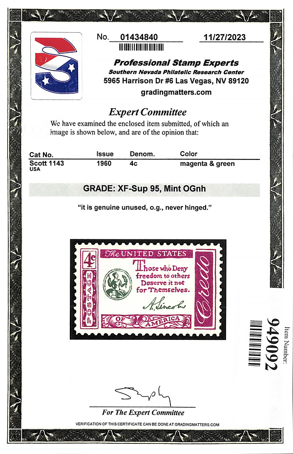 5206 nh 1143 image1960, 4¢ American Credo: Lincoln (Scott 1143), o.g., never hinged, Extremely Fine to Superb, with 2023 P.S.E. certificate graded XF-SUP 95.