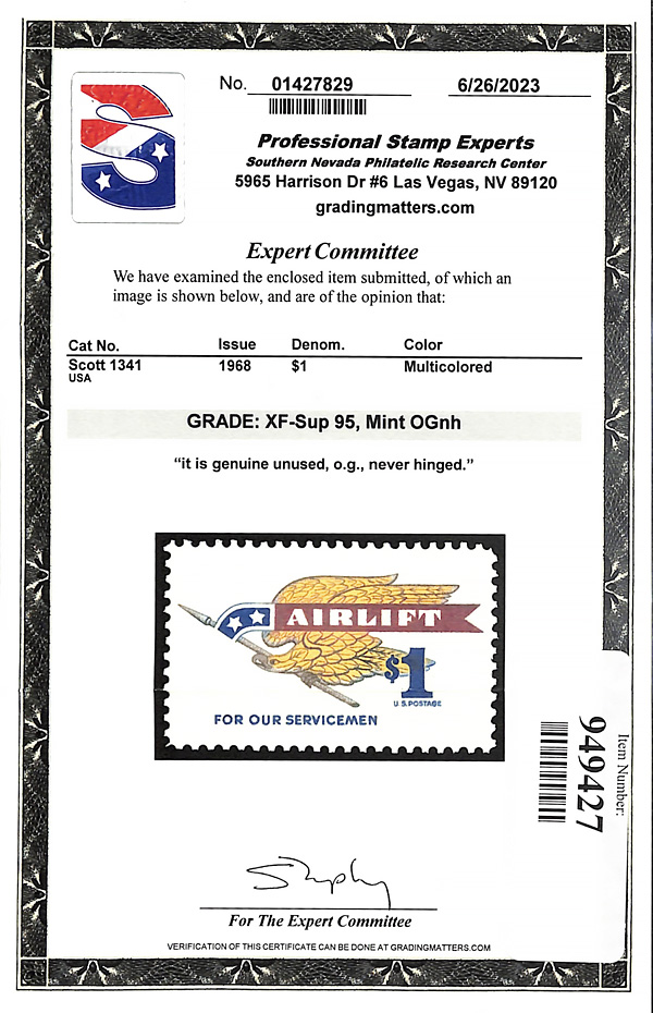 5217 nh 1341 image1968, $1 Airlift (Scott 1341), o.g., never hinged, Extremely Fine to Superb, with 2023 P.S.E. certificate graded XF-SUP 95.