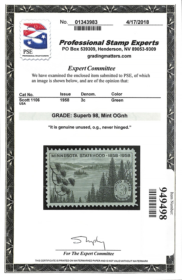 5204 nh 1106 image1958, 3¢ Minnesota Statehood (Scott 1106), o.g., never hinged, Superb, with 2018 P.S.E. certificate graded SUP 98.