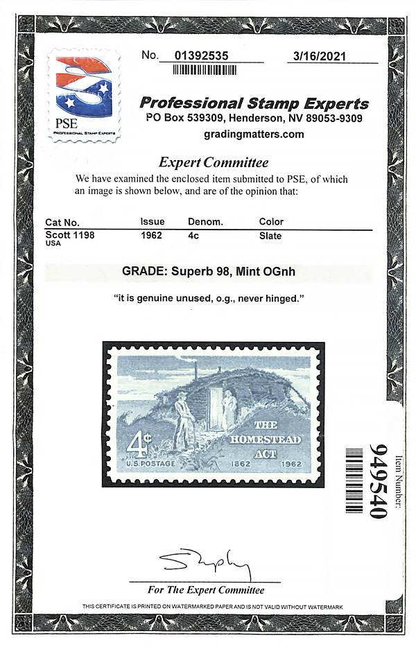 5210 nh 1198 image1962, 4¢ Homestead Act (Scott 1198), o.g., never hinged, Superb, with 2021 P.S.E. certificate graded SUP 98.