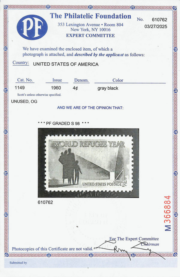5208 og 1149 image1960, 4¢ World Refugee Year (Scott 1149), o.g., very lightly hinged, Superb, with 2025 P.F. certificate graded SUP 98.