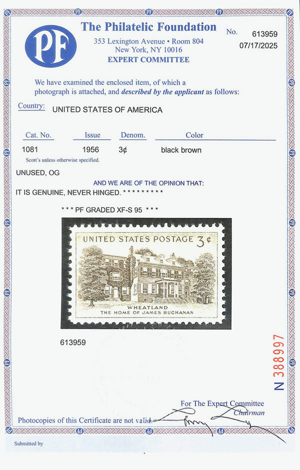 5201 nh 1081 image1956, 3¢ Wheatland (Scott 1081), o.g., never hinged, Extremely Fine to Superb, with 2025 P.F. certificate graded XF-SUP 95.