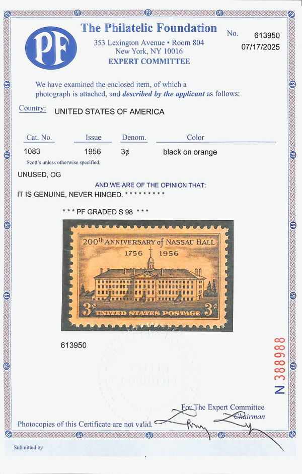 5202 nh 1083 image1956, 3¢ Nassau Hall (Scott 1083), o.g., never hinged, Superb, with 2025 P.F. certificate graded SUP 98.