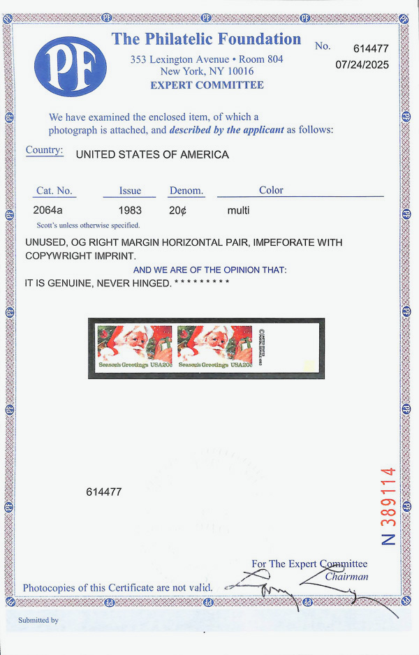 5226 nh 2064a image1983, 20¢ Christmas: Santa Claus, imperf. pair (Scott 2064a), o.g., never hinged, Very Fine, only 100-150 pairs issued.