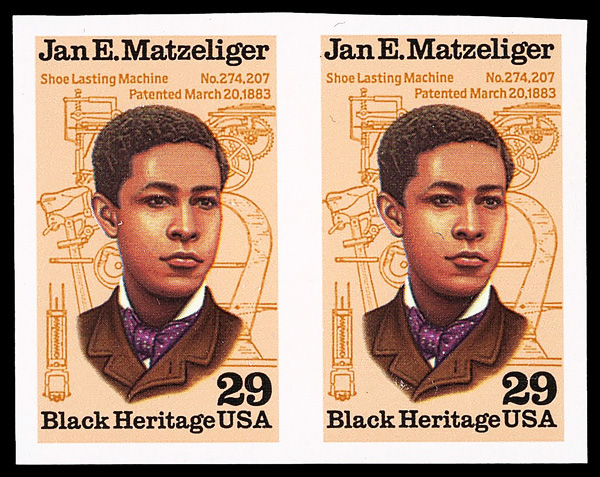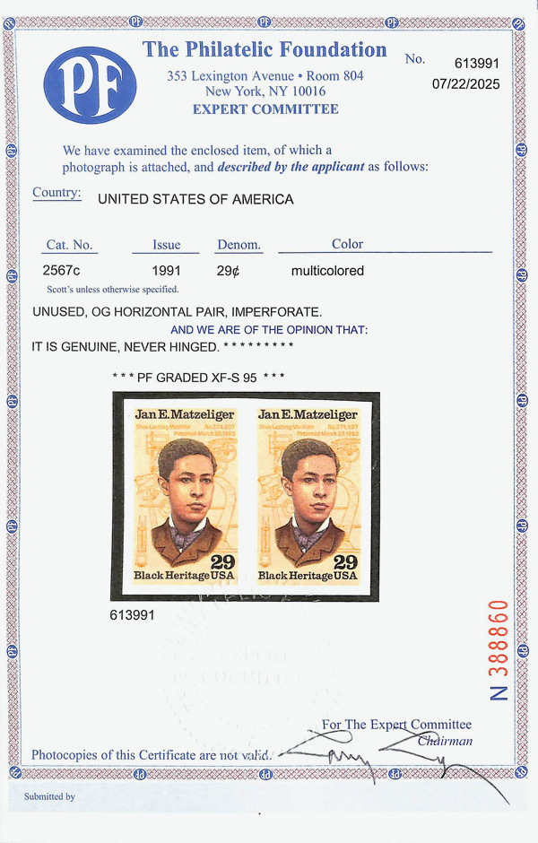 5240 nh 2567c image1991, 29¢ Jan Matzeliger, imperf. pair (Scott 2567c), o.g., never hinged, Extremely Fine to Superb, with 2025 P.F. certificate graded XF-SUP 95.