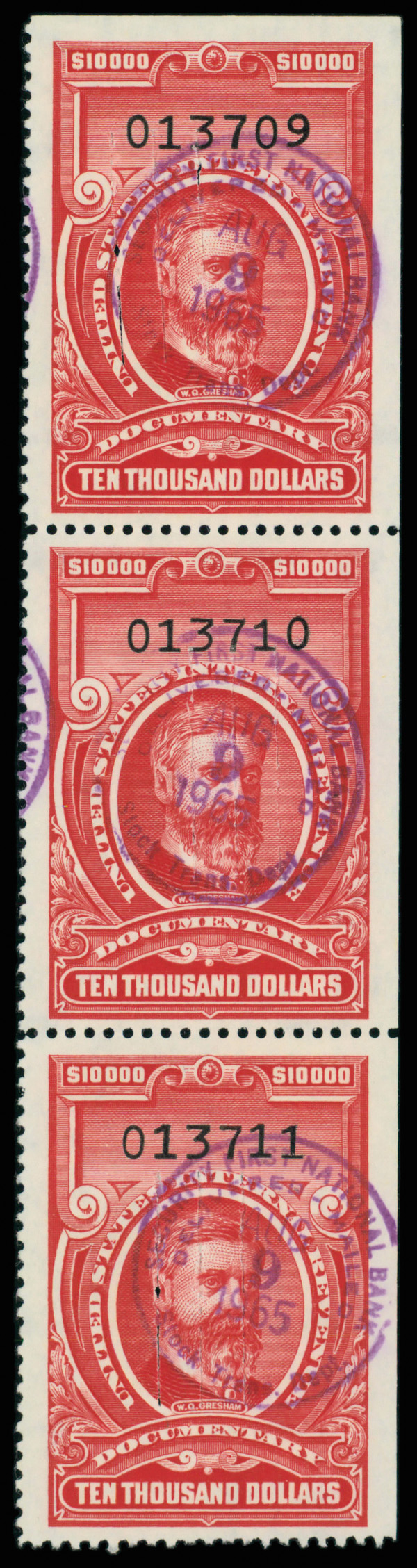5315 O R732 imageDocumentary, 1958, $10,000 Gresham (Scott R732), strip of 3, cut cancel, Extremely Fine.