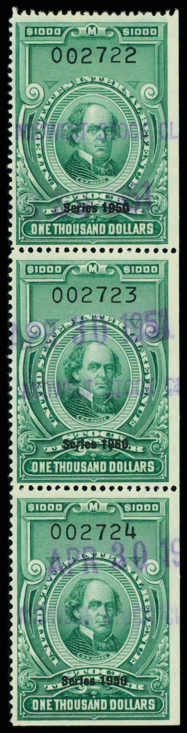 5318 O RD335 imageStock Transfer, 1950, $1,000 Chase (Scott RD335), vertical strip of 3, Fine to Very Fine.