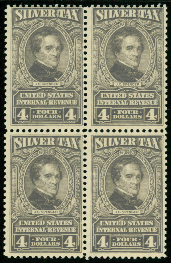 5320 nhbl RG123 imageSilver Tax, 1944, $4 gray (Scott RG123), block of 4, o.g., never hinged, Fine.