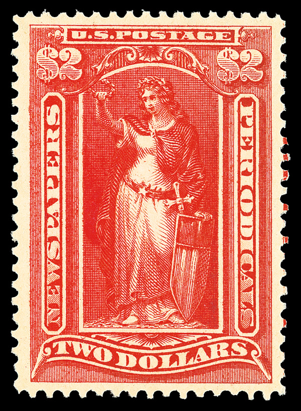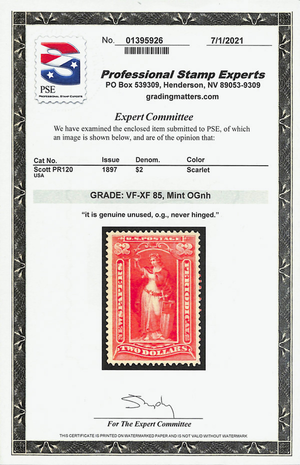 5287 nh PR120 imageNewspaper, 1897, $2 scarlet, Bureau printing, D.L. watermark (Scott PR120), o.g., never hinged, a striking example with vibrant color and superior centering; vertical guide line partially captured in right-side perforations, Very Fine to Extremely Fine, with 2021 P.S.E. certificate graded VF-XF 85.