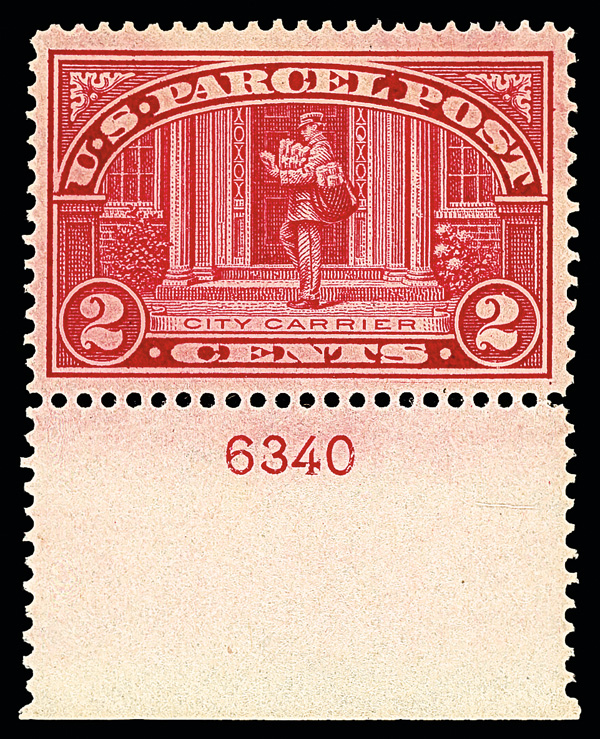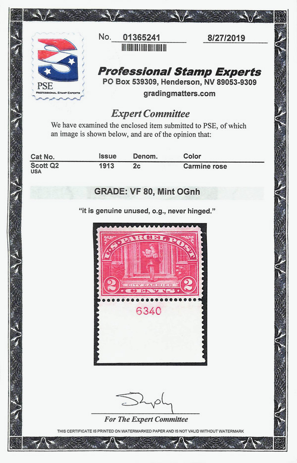 5288 nh Q2 imageParcel Post, 1913, 2¢ City Carrier (Scott Q2), wide bottom margin plate number 6340 single, o.g., never hinged, pretty positional with radiant color and sharp detail, Very Fine, with 2019 P.S.E. certificate graded VF 80.