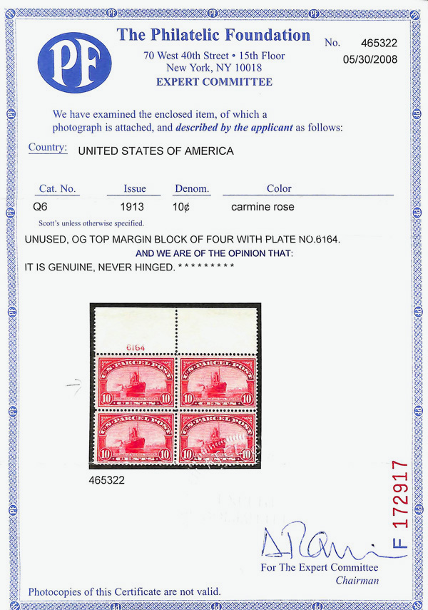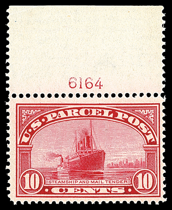 5289 nh Q6 imageParcel Post, 1913, 10¢ Steamship and Mail Tender (Scott Q6), full wide top margin plate number 6164 single, o.g., never hinged, Post Office fresh with vivid color on immaculate paper; an attractive wide top positional, Fine to Very Fine, with 2008 P.F. certificate for block of four, this position 1.