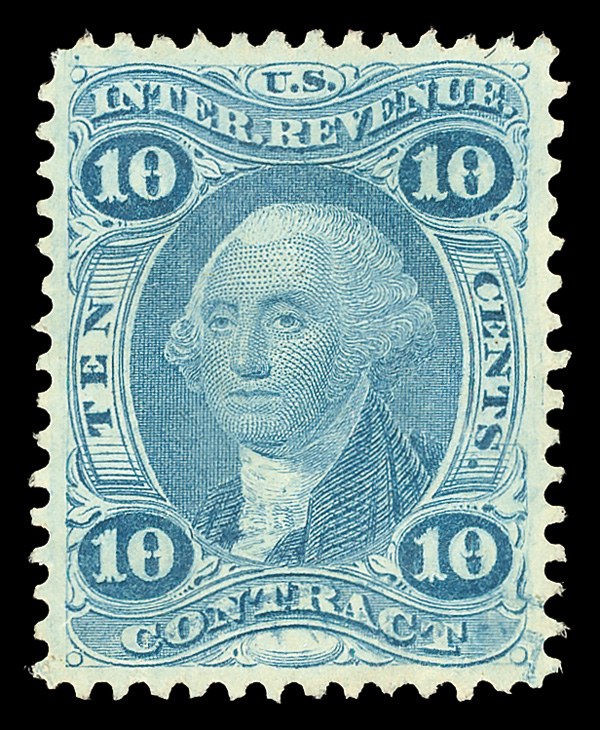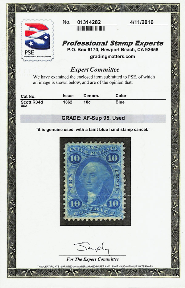 5314 O R34d imageRevenue, 1862, First Issue, 10¢ Contract, blue, perf'd, silk paper (Scott R34d), well-balanced margins, glowing intense color, the SMQ doesn't currently list this issue, Extremely Fine to Superb, with 2016 P.S.E. certificate graded XF-SUP 95.