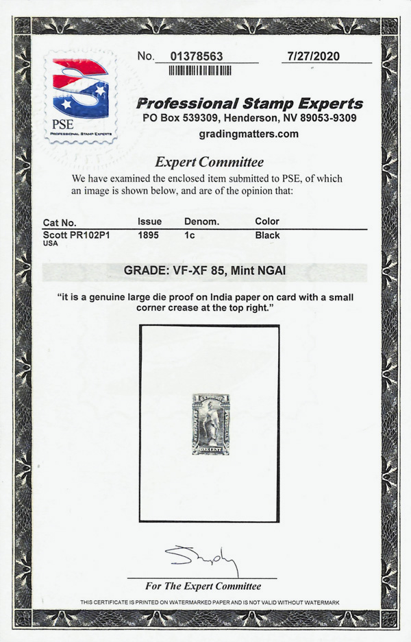5283 P PR102P1 imageNewspaper, 1895, 1¢ black, Bureau printing, large die proof on India paper (Scott PR102P1), Post Office fresh with crisp color on 67 x 99mm India on 77 x 109mm card; small corner crease at top right noted on certificate is truly trivial, Very Fine to Extremely Fine, with 2020 P.S.E. certificate graded VF-XF 85.