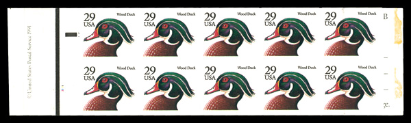 5297 BKnh BK174 image1991, $2.90 Wood Duck, booklet (Scott BK174), complete and unexploded, plate #3331, o.g., never hinged, Extremely Fine. (Image) Suggested Bid $200