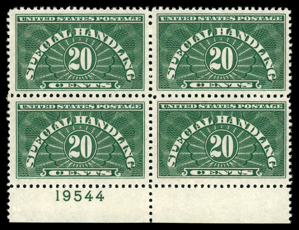 5294 nhbl QE3b imageSpecial Handling, 1955, 20¢ light green, dry printing (Scott QE3b), block of 4 with plate number, o.g., never hinged, Extremely Fine.