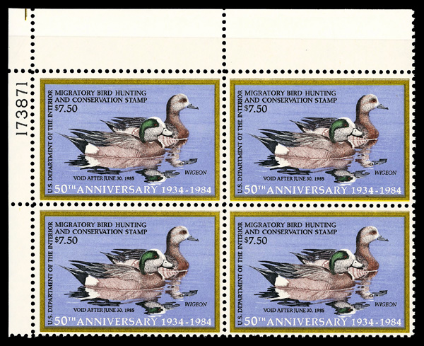 5352 nhbl RW51 imageFederal Duck Stamp, 1984, $7.50 Wigeons (Scott RW51), plate block of 4, o.g., never hinged, Very Fine to Extremely Fine.