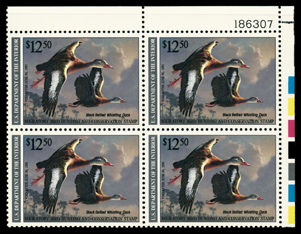 5357 nhbl RW57 imageFederal Duck Stamp, 1990, $12.50 Whistling Duck (Scott RW57), plate block of 4, o.g., never hinged, Extremely Fine to Superb.