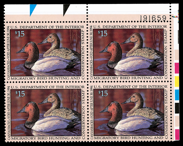 5358 nhbl RW60 imageFederal Duck Stamp, 1993, $15 Canvasbacks (Scott RW60), plate block of 4, o.g., never hinged, Very Fine to Extremely Fine.