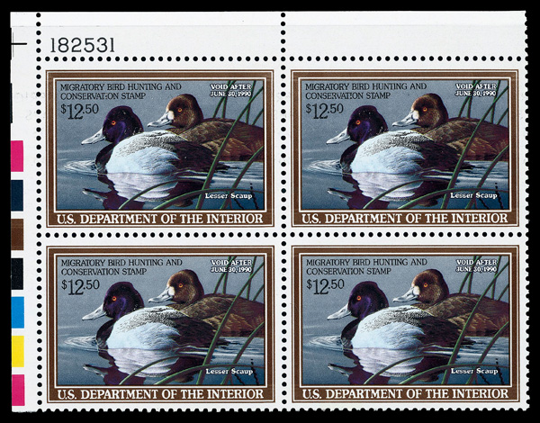 5356 nhbl RW56 imageFederal Duck Stamp, 1989, $12.50 Lesser Scaup (Scott RW56), plate block of 4, o.g., never hinged, Very Fine to Extremely Fine.