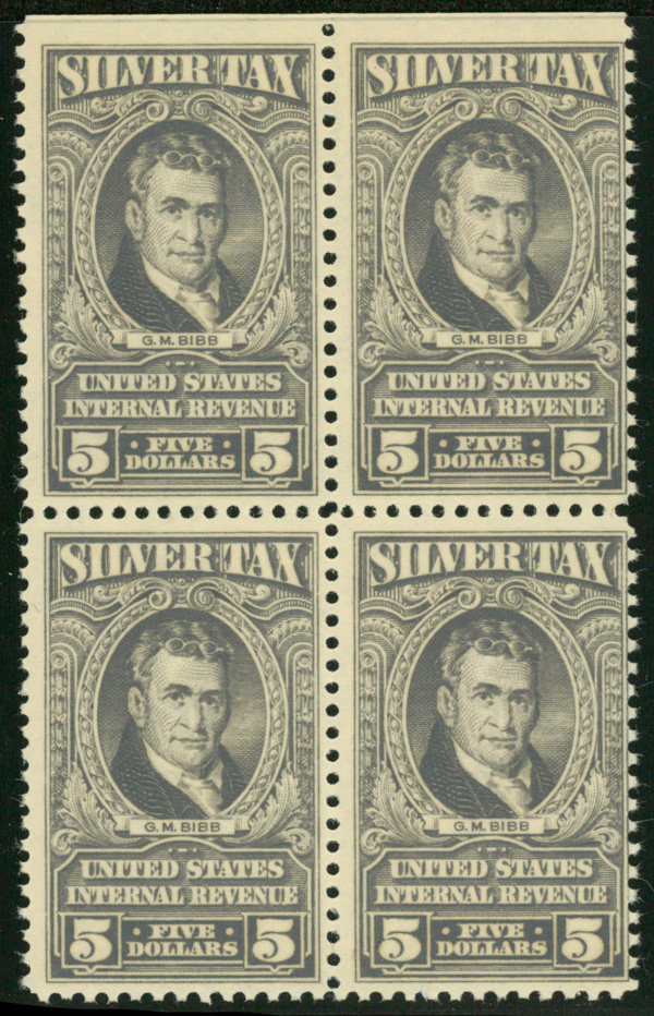 5321 nhbl RG124 imageSilver Tax, 1944, $5 gray (Scott RG124), top margin straight edge block of 4, o.g., never hinged, Fine.