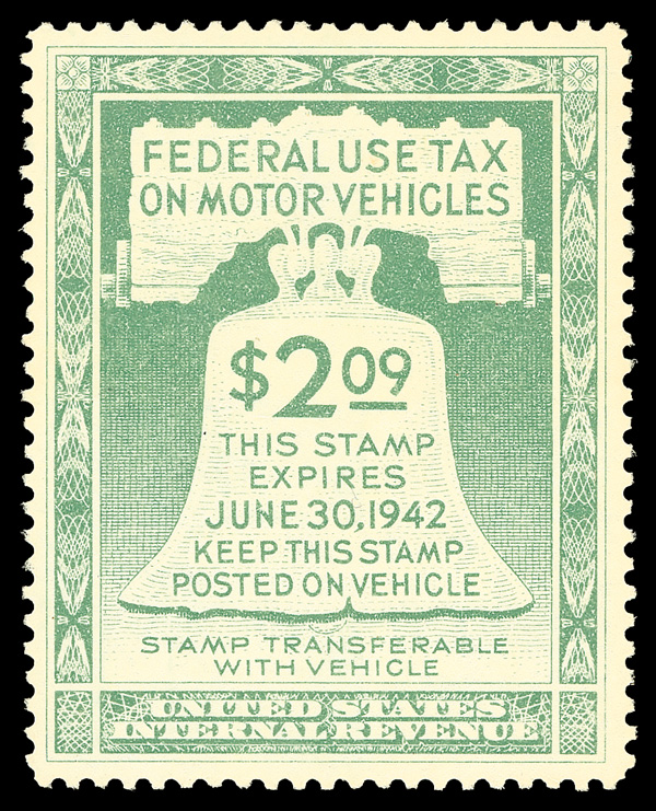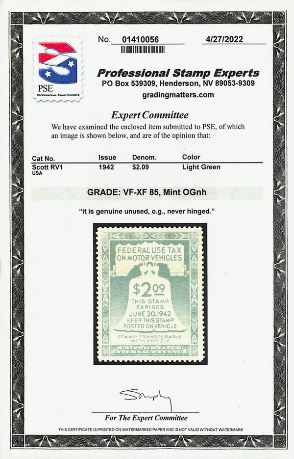 5326 nh RV1 imageMotor Vehicle Use, 1942, $2.09 light green (Scott RV1), broad borders, rich visual appeal, the SMQ doesn't currently list this issue, o.g., never hinged, Very Fine to Extremely Fine, with 2022 P.S.E. certificate graded VF-XF 85.