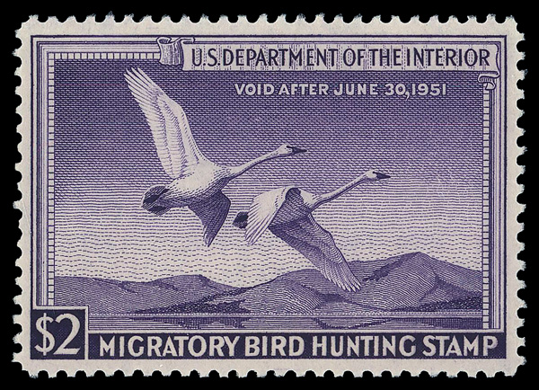 5335 nh RW17 imageFederal Duck Stamp, 1950, $2 Trumpeter Swans (Scott RW17), o.g., never hinged, Extremely Fine.
