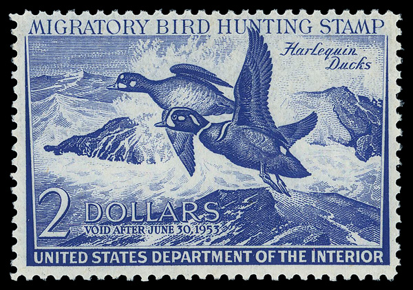 5337 nh RW19 imageFederal Duck Stamp, 1952, $2 Harlequin Ducks (Scott RW19), o.g., never hinged, Very Fine.