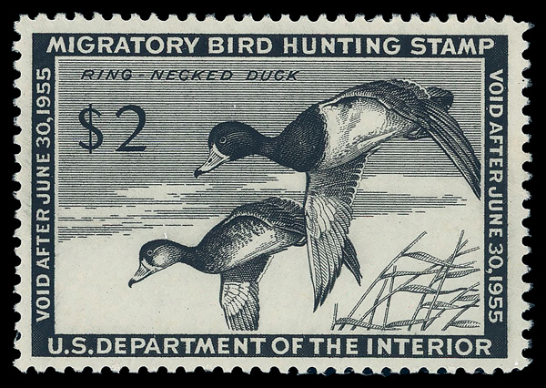 5339 nh RW21 imageFederal Duck Stamp, 1954, $2 Ring-necked Ducks (Scott RW21), o.g., never hinged, Very Fine to Extremely Fine.