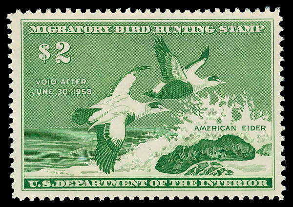 5342 nh RW24 imageFederal Duck Stamp, 1957, $2 American Eider (Scott RW24), o.g., never hinged, Extremely Fine.