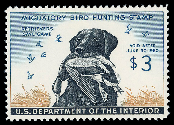 5344 nh RW26 imageFederal Duck Stamp, 1959, $3 Labrador Retriever (Scott RW26), o.g., never hinged, Very Fine to Extremely Fine.