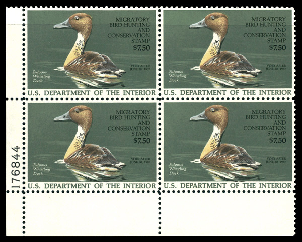 5353 nhbl RW53 imageFederal Duck Stamp, 1986, $7.50 Fulvous Whistling Duck (Scott RW53), plate block of 4, o.g., never hinged, Extremely Fine.