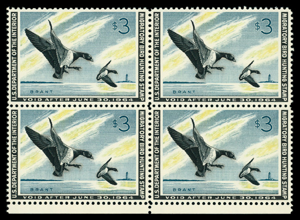 5349 nhbl RW30 imageFederal Duck Stamp, 1963, $3 Brants (Scott RW30), block of 4, o.g., never hinged, Very Fine.