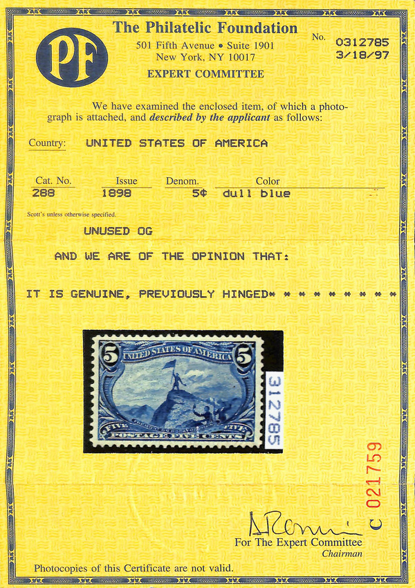 7034 og 288 image1898, 5¢ Trans-Miss. (Scott 288), o.g., very lightly hinged, fresh and sound with immense color and pleasing centering, Very Fine, with 1997 P.F. certificate.