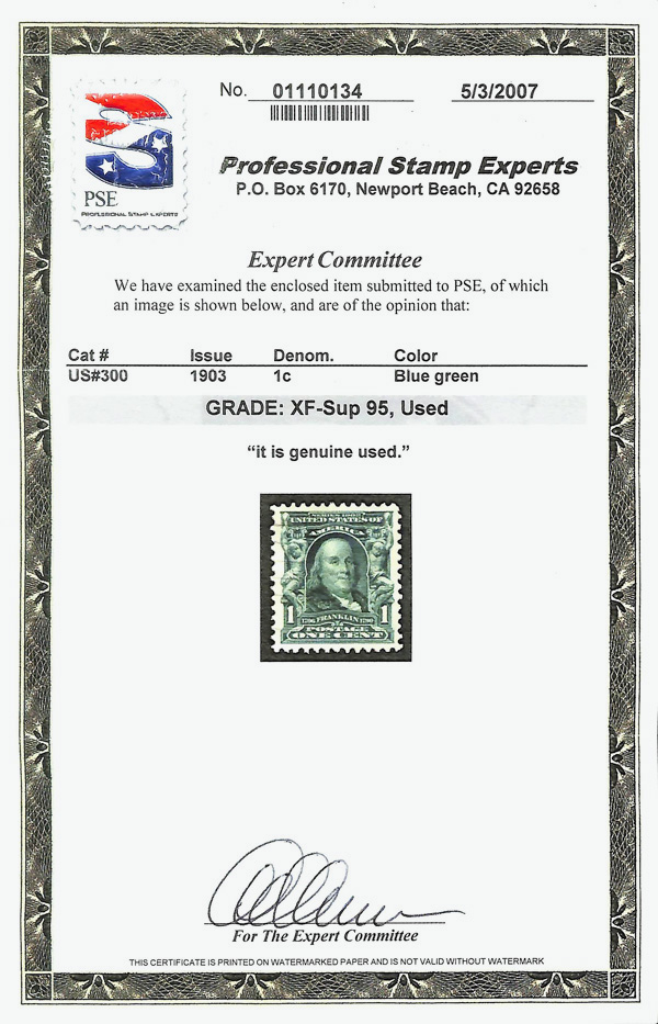 7040 O 300 image1903, 1¢ blue green (Scott 300), a magnificent example, fresh as the day it was printed, with luxuriant color, clean detail, and the faintest possible wavy line cancel, Extremely Fine to Superb, with 2007 P.S.E. certificate graded XF-SUP 95.