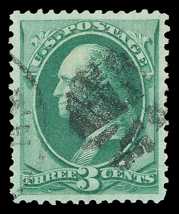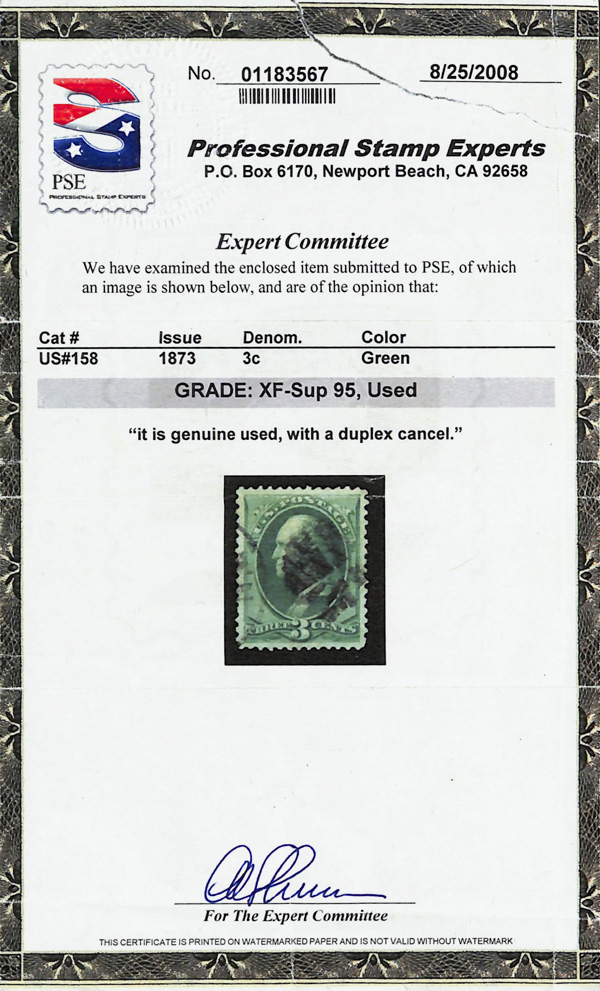 7013 O 158 image1873, 3¢ green, C.B.N.C. printing (Scott 158), precisely balanced centering, duplex cancel, Extremely Fine to Superb, with 2008 P.S.E. certificate graded XF-SUP 95.