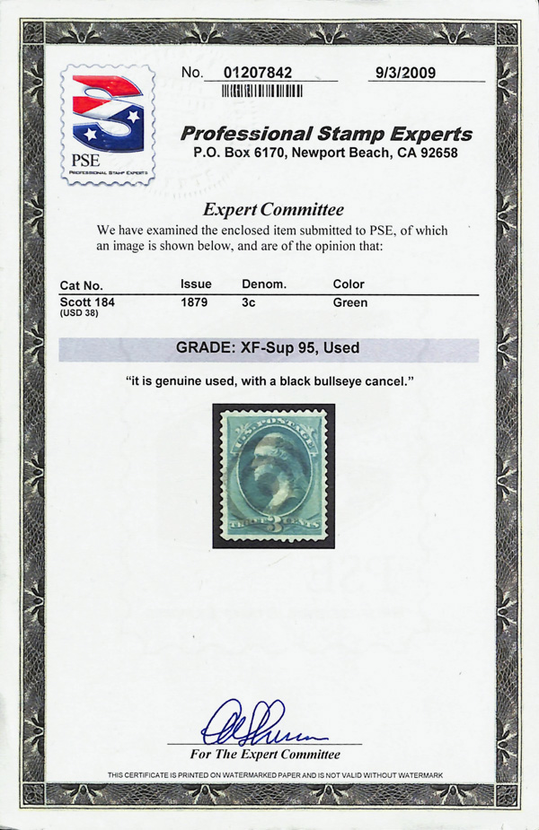 7017 O 184 image1879, 3¢ green, A.B.N.C. printing (Scott 184), perfectly positioned margins, black bullseye cancel, Extremely Fine to Superb, with 2009 P.S.E. certificate graded XF-SUP 95.