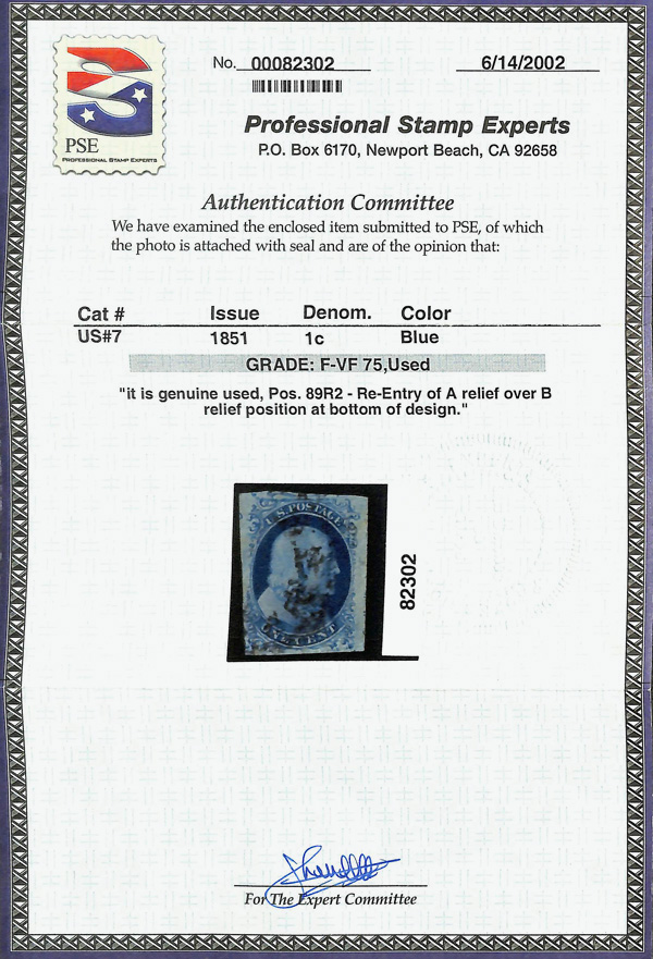 7002 O 7 var. image1851, 1¢ blue, type II, double transfer (Scott 7 var.), position 89R2, a fresh and sound example showing re-entry of A relief over B relief at bottom of design, Fine to Very Fine, signed K Hennig, with 2002 P.S.E. certificate graded F-VF 75.