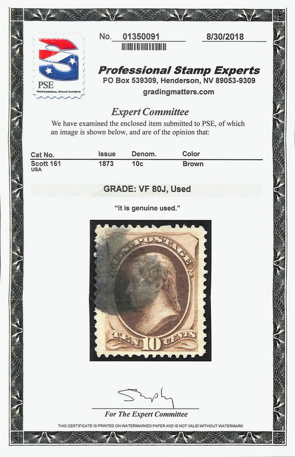 7014 O 161 image1873, 10¢ brown, C.B.N.C. printing (Scott 161), a lovely jumbo, with strong color and clean detail, Very Fine, with 2018 P.S.E. certificate graded VF 80 J.