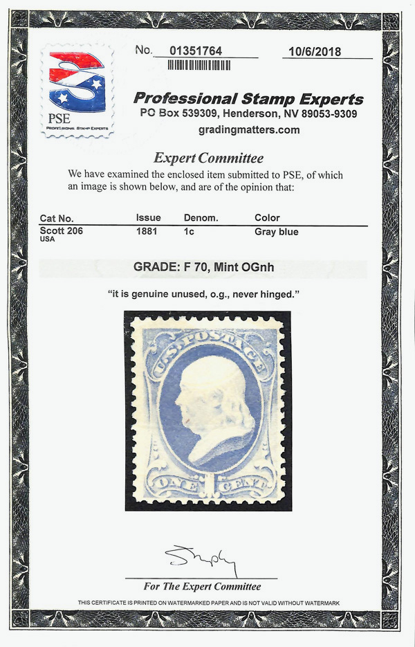 7018 nh 206 image1881, 1¢ gray blue, re-engraved (Scott 206), o.g., never hinged, fresh and sound on bright paper, Fine, with 2018 P.S.E. certificate graded F 70.