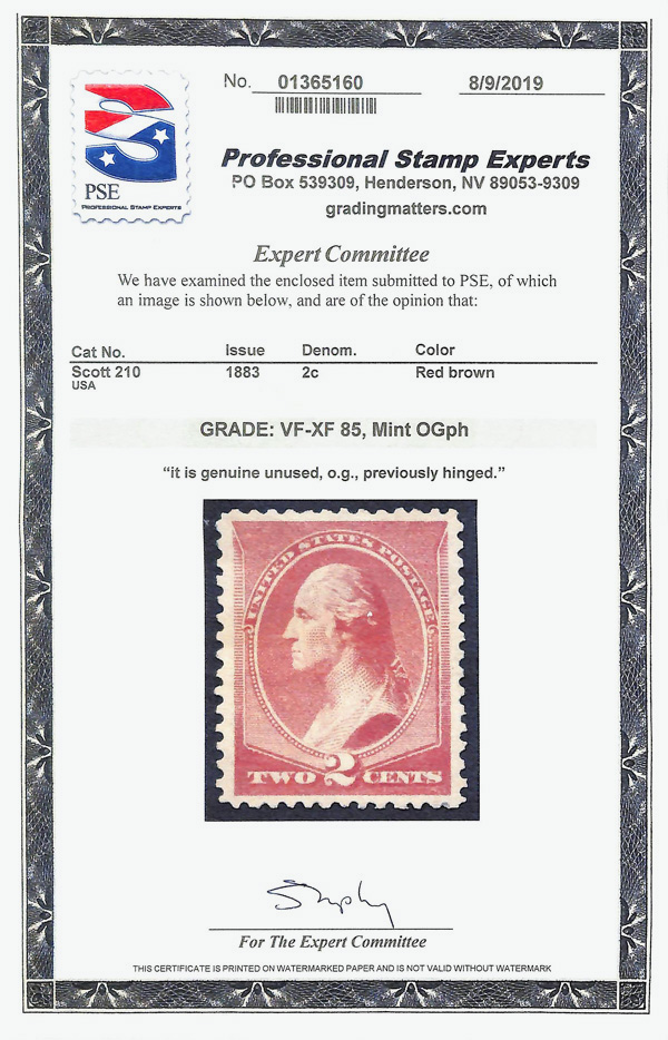 7020 og 210 image1883, 2¢ red brown (Scott 210), o.g., very lightly hinged, wonderfully centered in strong color on bright paper, Very Fine to Extremely Fine, with 2019 P.S.E. certificate graded VF-XF 85.