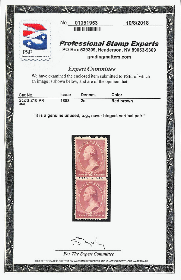 7019 nh 210 image1883, 2¢ red brown (Scott 210), vertical pair, o.g., never hinged, sound with bold color and crisp detail, Fine to Very Fine, with 2018 P.S.E. certificate.