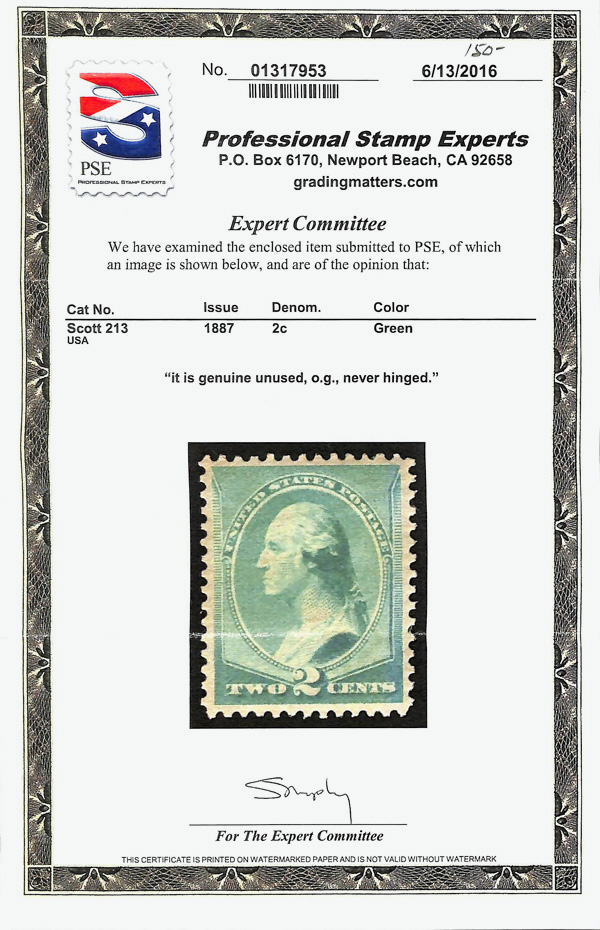 7021 nh 213 image1887, 2¢ green (Scott 213), o.g., never hinged, Post Office fresh and sound; a pretty example, Very Fine, with 2016 P.S.E. certificate.